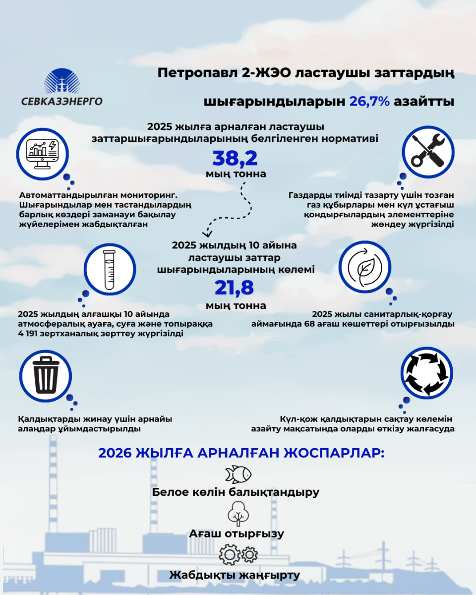 Петропавл 2-ЖЭО, Солтүстік Қазақстанды өмірлік қажетті энергиямен қамтамасыз ететін, ірі өнеркәсіптік кәсіпорын, қоршаған ортаға әсерін төмендетуде айтарлықтай прогресс көрсетеді. 2025 жылдың қорытындысы бойынша станция ластаушы заттардың нақты шығарындыларын қысқартты, бұл ол үшін белгіленген 38,3 мың тонна рұқсат етілген жылдық лимиттен 26,7%-ға төмен.