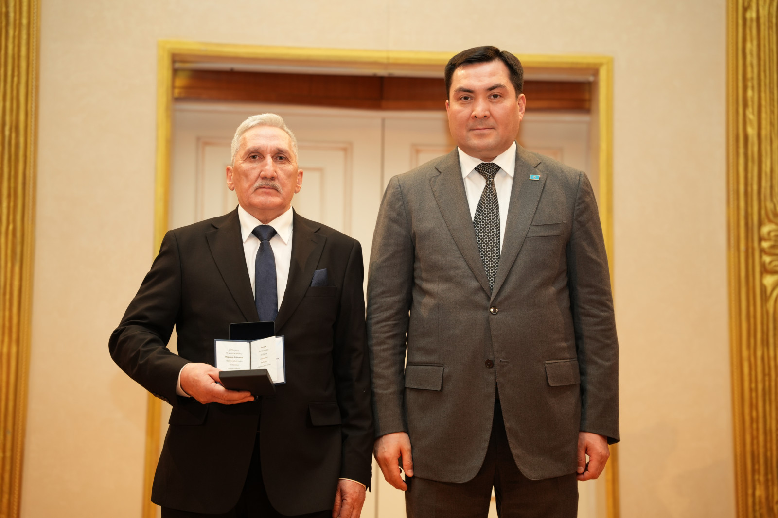 Министр энергетики Ерлан Аккенжанов вручил медаль «Ерен еңбегі үшін» электромонтеру по эксплуатации распределительных сетей Жамбылского электросетевого района АО «Северо-Казахстанская Распределительная Электросетевая Компания» Бауржану Жакупову.