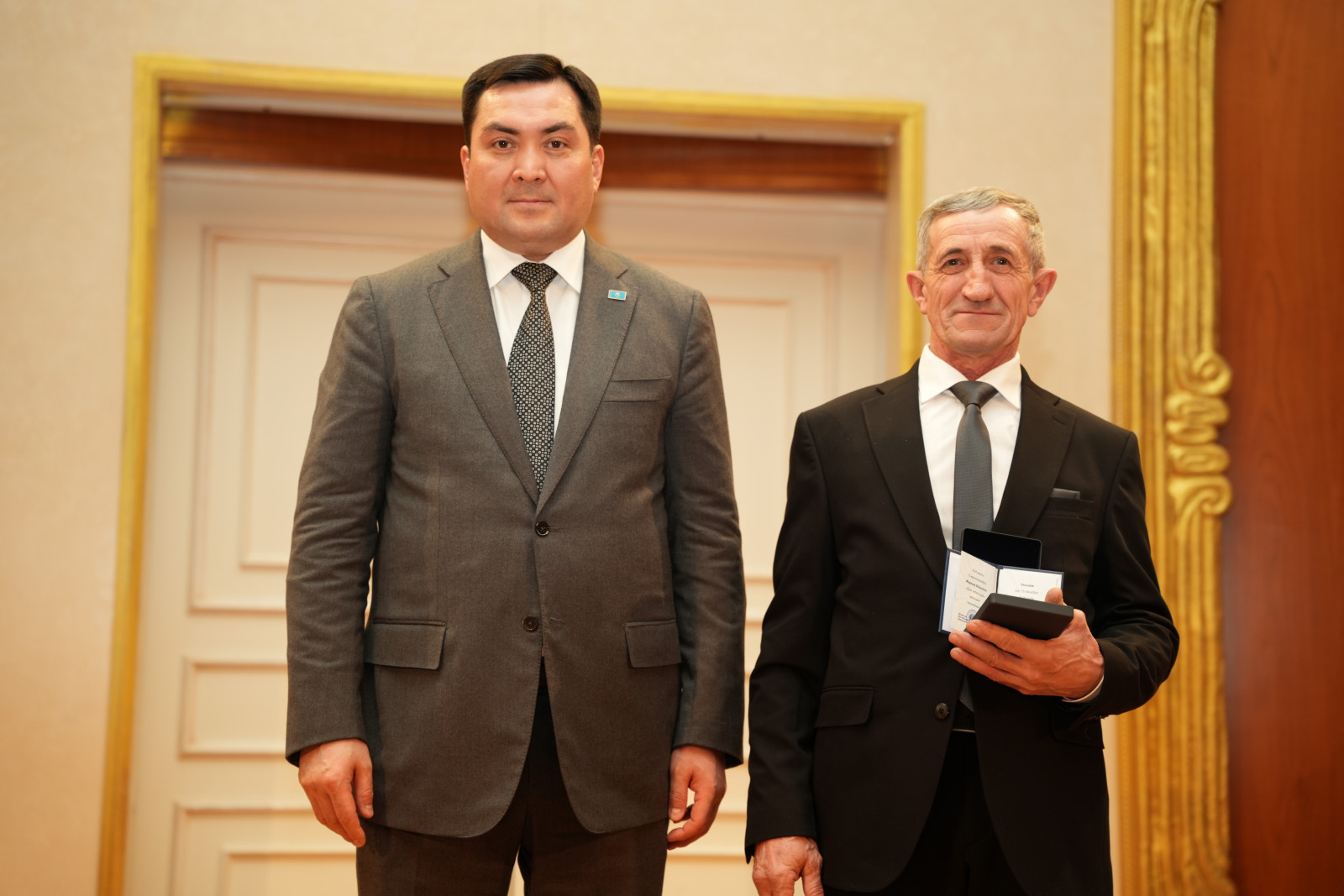 Министр энергетики Ерлан Аккенжанов вручил медаль «Ерен еңбегі үшін» электромонтеру по эксплуатации распределительных сетей Дубровинского мастерского участка Мамлютского электросетевого района АО «Северо-Казахстанская РЭК» Петру Харькову.